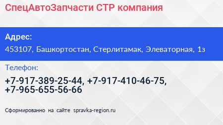 СпецАвтоЗапчасти СТР, компания по адресу 453107, Башкортостан, Стерлитамак, Элеваторная, 1з в дальнейшем Организация, размещена в следующих категориях: