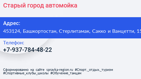 Старый город, автомойка по адресу 453124, Башкортостан, Стерлитамак, Сакко и Ванцетти, 15 в дальнейшем Организация, размещена в следующих категориях:
