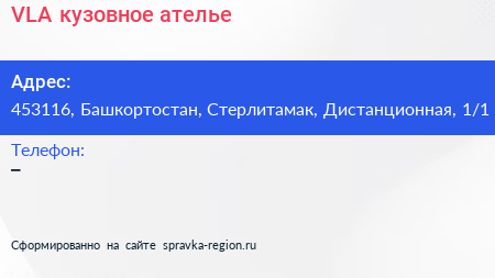 VLA, кузовное ателье по адресу 453116, Башкортостан, Стерлитамак, Дистанционная, 1/1 в дальнейшем Организация, размещена в следующих категориях: