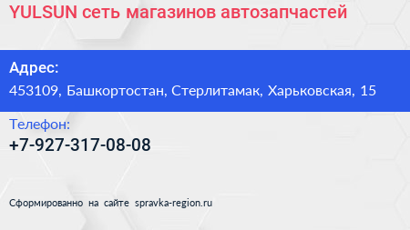 YULSUN, сеть магазинов автозапчастей по адресу 453109, Башкортостан, Стерлитамак, Харьковская, 15 в дальнейшем Организация, размещена в следующих категориях: