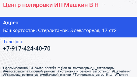 Центр полировки, ИП Машкин В.Н. по адресу Башкортостан, Стерлитамак, Элеваторная, 17 ст2 в дальнейшем Организация, размещена в следующих категориях: