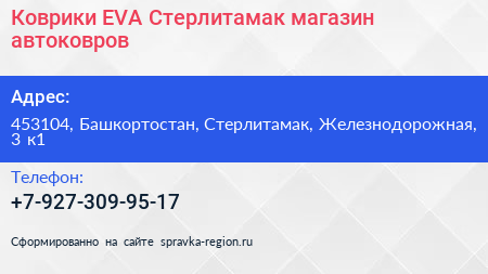 Коврики EVA Стерлитамак, магазин автоковров по адресу 453104, Башкортостан, Стерлитамак, Железнодорожная, 3 к1 в дальнейшем Организация, размещена в следующих категориях: