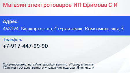 Магазин электротоваров, ИП Ефимова С.И. по адресу 453124, Башкортостан, Стерлитамак, Комсомольская, 5 в дальнейшем Организация, размещена в следующих категориях: