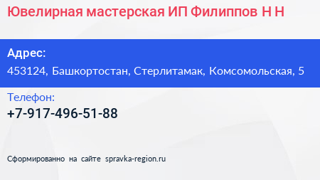 Ювелирная мастерская, ИП Филиппов Н.Н. по адресу 453124, Башкортостан, Стерлитамак, Комсомольская, 5 в дальнейшем Организация, размещена в следующих категориях: