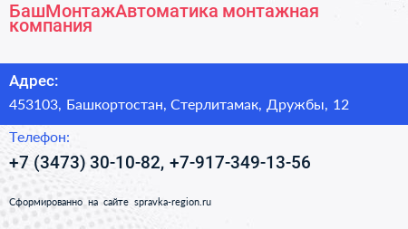 БашМонтажАвтоматика, монтажная компания по адресу 453103, Башкортостан, Стерлитамак, Дружбы, 12 в дальнейшем Организация, размещена в следующих категориях: