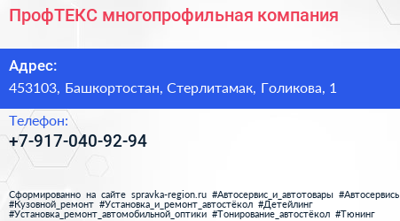 ПрофТЕКС, многопрофильная компания по адресу 453103, Башкортостан, Стерлитамак, Голикова, 1 в дальнейшем Организация, размещена в следующих категориях: