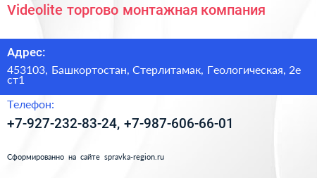 Videolite, торгово-монтажная компания по адресу 453103, Башкортостан, Стерлитамак, Геологическая, 2е ст1 в дальнейшем Организация, размещена в следующих категориях: