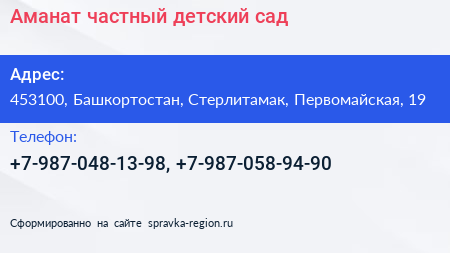 Аманат, частный детский сад по адресу 453100, Башкортостан, Стерлитамак, Первомайская, 19 в дальнейшем Организация, размещена в следующих категориях:
