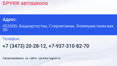 БРУКК, автошкола по адресу 453100, Башкортостан, Стерлитамак, Коммунистическая, 30 в дальнейшем Организация, размещена в следующих категориях: