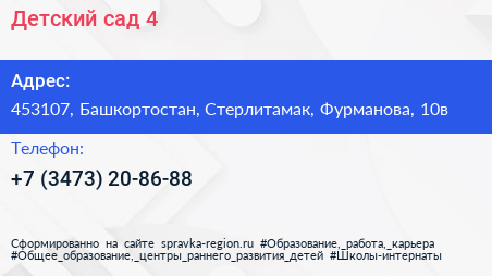 Детский сад №4 по адресу 453107, Башкортостан, Стерлитамак, Фурманова, 10в в дальнейшем Организация, размещена в следующих категориях: