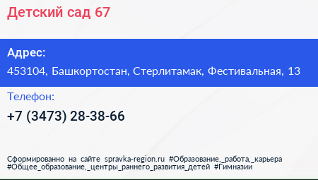 Детский сад №67 по адресу 453104, Башкортостан, Стерлитамак, Фестивальная, 13 в дальнейшем Организация, размещена в следующих категориях: