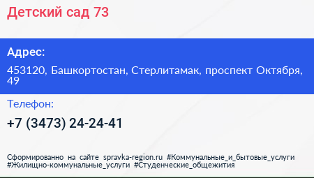 Детский сад №73 по адресу 453120, Башкортостан, Стерлитамак, проспект Октября, 49 в дальнейшем Организация, размещена в следующих категориях: