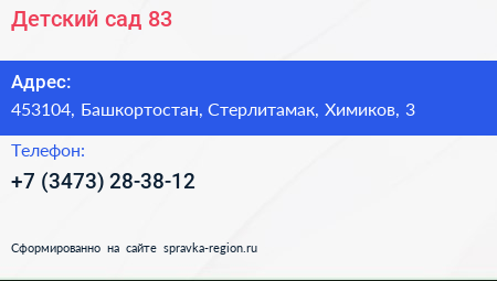 Детский сад №83 по адресу 453104, Башкортостан, Стерлитамак, Химиков, 3 в дальнейшем Организация, размещена в следующих категориях: