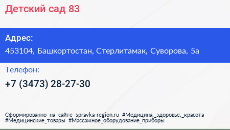 Детский сад №83 по адресу 453104, Башкортостан, Стерлитамак, Суворова, 5а в дальнейшем Организация, размещена в следующих категориях: