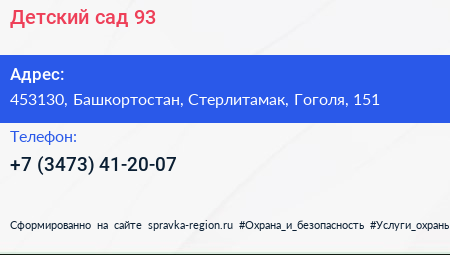 Детский сад №93 по адресу 453130, Башкортостан, Стерлитамак, Гоголя, 151 в дальнейшем Организация, размещена в следующих категориях: