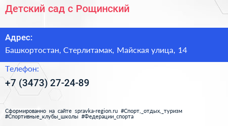 Детский сад с.Рощинский по адресу Башкортостан, Стерлитамак, Майская улица, 14 в дальнейшем Организация, размещена в следующих категориях: