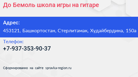 До Бемоль, школа игры на гитаре по адресу 453121, Башкортостан, Стерлитамак, Худайбердина, 150а в дальнейшем Организация, размещена в следующих категориях: