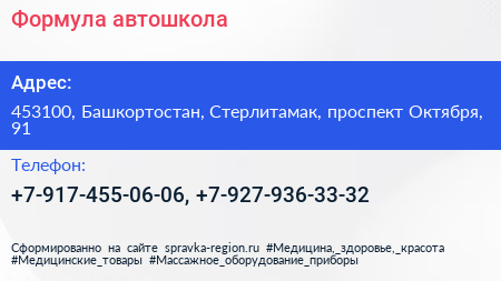 Формула, автошкола по адресу 453100, Башкортостан, Стерлитамак, проспект Октября, 91 в дальнейшем Организация, размещена в следующих категориях: