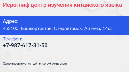 Иероглиф, центр изучения китайского языка по адресу 453100, Башкортостан, Стерлитамак, Артёма, 146а в дальнейшем Организация, размещена в следующих категориях: