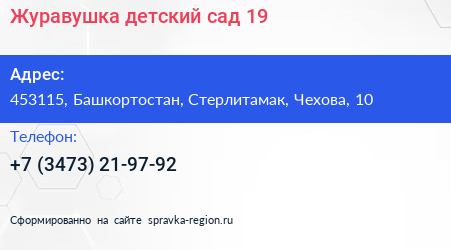 Журавушка, детский сад №19 по адресу 453115, Башкортостан, Стерлитамак, Чехова, 10 в дальнейшем Организация, размещена в следующих категориях: