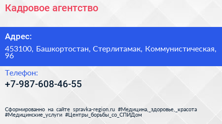 Кадровое агентство по адресу 453100, Башкортостан, Стерлитамак, Коммунистическая, 96 в дальнейшем Организация, размещена в следующих категориях: