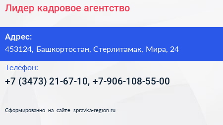 Лидер, кадровое агентство по адресу 453124, Башкортостан, Стерлитамак, Мира, 24 в дальнейшем Организация, размещена в следующих категориях: