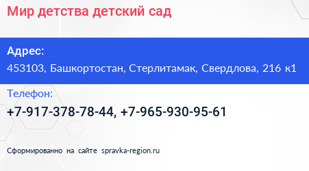 Мир детства, детский сад по адресу 453103, Башкортостан, Стерлитамак, Свердлова, 216 к1 в дальнейшем Организация, размещена в следующих категориях: