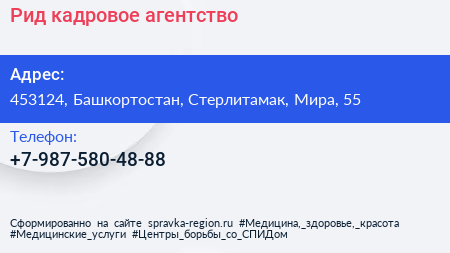 Рид, кадровое агентство по адресу 453124, Башкортостан, Стерлитамак, Мира, 55 в дальнейшем Организация, размещена в следующих категориях: