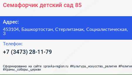 Семафорчик, детский сад №85 по адресу 453104, Башкортостан, Стерлитамак, Социалистическая, 3 в дальнейшем Организация, размещена в следующих категориях: