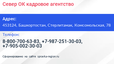Север-ОК, кадровое агентство по адресу 453124, Башкортостан, Стерлитамак, Комсомольская, 78 в дальнейшем Организация, размещена в следующих категориях: