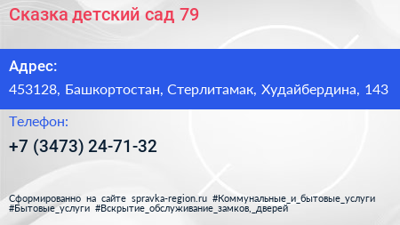 Сказка, детский сад №79 по адресу 453128, Башкортостан, Стерлитамак, Худайбердина, 143 в дальнейшем Организация, размещена в следующих категориях: