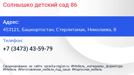 Солнышко, детский сад №86 по адресу 453121, Башкортостан, Стерлитамак, Николаева, 8 в дальнейшем Организация, размещена в следующих категориях: