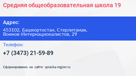 Средняя общеобразовательная школа №19 по адресу 453102, Башкортостан, Стерлитамак, Воинов-Интернационалистов, 29 в дальнейшем Организация, размещена в следующих категориях: