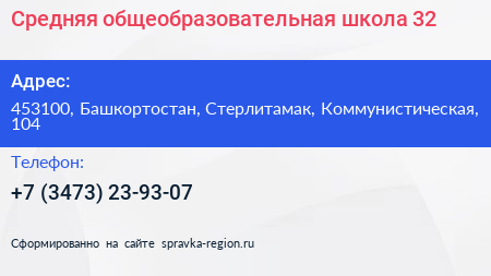 Средняя общеобразовательная школа №32 по адресу 453100, Башкортостан, Стерлитамак, Коммунистическая, 104 в дальнейшем Организация, размещена в следующих категориях: