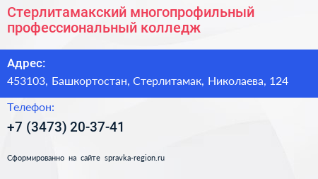 Стерлитамакский многопрофильный профессиональный колледж по адресу 453103, Башкортостан, Стерлитамак, Николаева, 124 в дальнейшем Организация, размещена в следующих категориях: