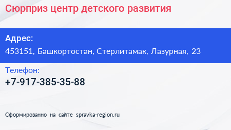 Сюрприз, центр детского развития по адресу 453151, Башкортостан, Стерлитамак, Лазурная, 23 в дальнейшем Организация, размещена в следующих категориях: