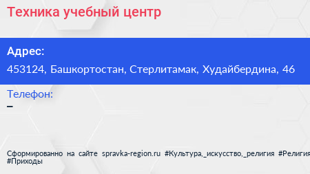 Техника, учебный центр по адресу 453124, Башкортостан, Стерлитамак, Худайбердина, 46 в дальнейшем Организация, размещена в следующих категориях: