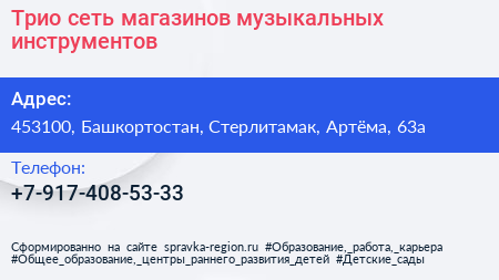 Трио, сеть магазинов музыкальных инструментов по адресу 453100, Башкортостан, Стерлитамак, Артёма, 63а в дальнейшем Организация, размещена в следующих категориях:
