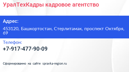 УралТехКадры, кадровое агентство по адресу 453120, Башкортостан, Стерлитамак, проспект Октября, 69 в дальнейшем Организация, размещена в следующих категориях: