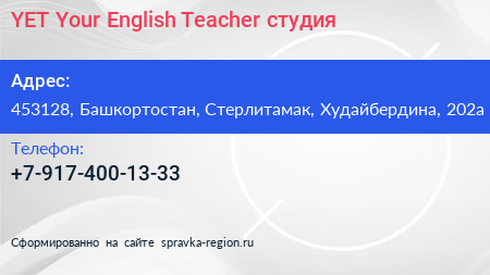 YET-Your English Teacher, студия по адресу 453128, Башкортостан, Стерлитамак, Худайбердина, 202а в дальнейшем Организация, размещена в следующих категориях: