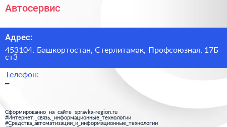 Автосервис по адресу 453104, Башкортостан, Стерлитамак, Профсоюзная, 17Б ст3 в дальнейшем Организация, размещена в следующих категориях: