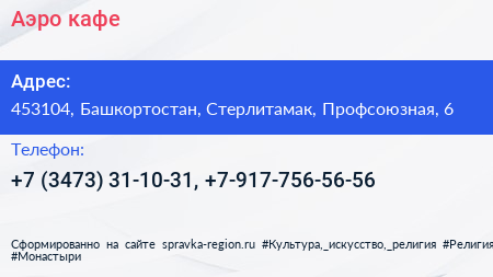 Аэро, кафе по адресу 453104, Башкортостан, Стерлитамак, Профсоюзная, 6 в дальнейшем Организация, размещена в следующих категориях: