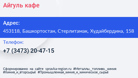 Для связи с организацией воспользуйтесь номером телефона: +7 (3473) 20-47-15. Ежедневно с 09:00 до 21:00, вы можете обратиться в эту организацию.
