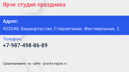 Ярче, студия праздника по адресу 453140, Башкортостан, Стерлитамак, Фестивальная, 1 в дальнейшем Организация, размещена в следующих категориях: