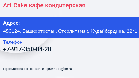 Art Cake, кафе-кондитерская по адресу 453124, Башкортостан, Стерлитамак, Худайбердина, 22/1 в дальнейшем Организация, размещена в следующих категориях: