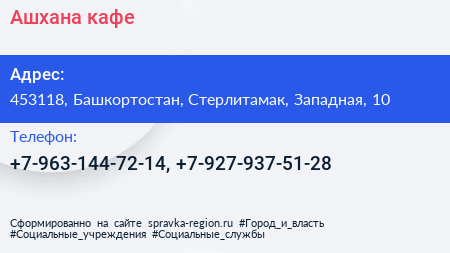 Ашхана, кафе по адресу 453118, Башкортостан, Стерлитамак, Западная, 10 в дальнейшем Организация, размещена в следующих категориях: