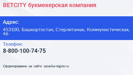 BETCITY, букмекерская компания по адресу 453100, Башкортостан, Стерлитамак, Коммунистическая, 46 в дальнейшем Организация, размещена в следующих категориях: