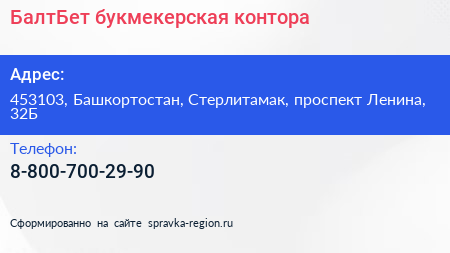 БалтБет, букмекерская контора по адресу 453103, Башкортостан, Стерлитамак, проспект Ленина, 32Б в дальнейшем Организация, размещена в следующих категориях: