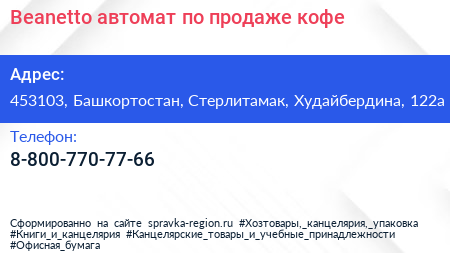 Beanetto, автомат по продаже кофе по адресу 453103, Башкортостан, Стерлитамак, Худайбердина, 122а в дальнейшем Организация, размещена в следующих категориях: