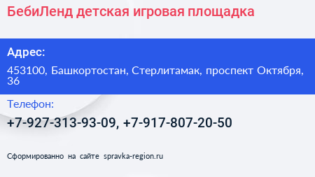 БебиЛенд, детская игровая площадка по адресу 453100, Башкортостан, Стерлитамак, проспект Октября, 36 в дальнейшем Организация, размещена в следующих категориях: